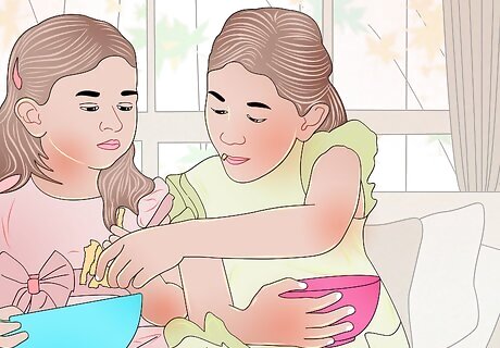 Don't panic if your kids share food items and utensils. While it's best to avoid the sharing of straws, sippy cups, forks, spoons, glasses, and food, there's no need to freak out if your children share. There is so much contact amongst siblings that there is little point in trying to prevent it. Among your kid’s play group friends, you should try to prevent kids from sharing slobbered-on items, but it's not a huge deal if some sharing happens before you can intervene. Absolutely limit the sharing of food items if the other children are clearly sick or if your child has food allergies.