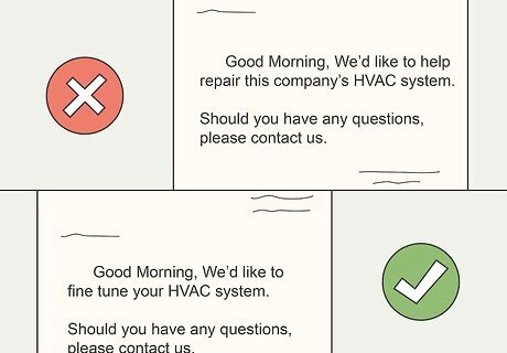 Address potential clients like people, not businesses. Don’t refer to the client as a “company” in your various interactions. Instead, use the “you” pronoun frequently, which shows that you view your customers as people, and not businesses. Treat all potential clientele with kindness, and respect their wishes at the end of a cordial conversation. If a business owner doesn’t want to work with you, respect their decision. Try saying something like “We’d like to fine tune your HVAC system” instead of “We’d like to help repair this company’s HVAC system.”
