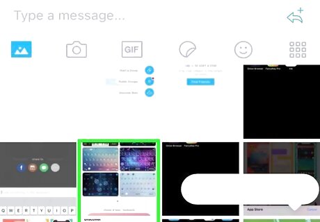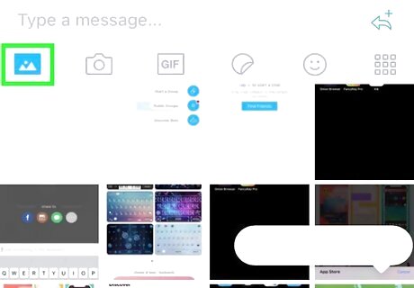 Tap the + to the left of the text box. An icon bar will appear beneath the chat, and your phone’s photo gallery will appear just below it.