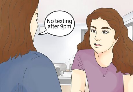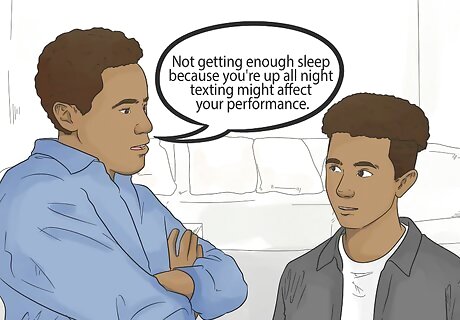 Discuss how texting is bad for their health. Your teen may think you’re exaggerating when you tell them that texting can have a negative impact on their health, but it’s actually true. Teens often text late into the night, which results in not getting enough sleep. Not only does this affect the way they feel, but it can impact their grades, social activities, and appearance. To make this point really hit home, talk about how the lack of sleep can affect your teen’s life personally. Knowing your audience can make a huge difference in how effective this boundary is. For instance, if your child really enjoys playing football, you might say "Not getting enough sleep because you're up all night texting might affect your performance." Or, if your teen is concerned about their appearance, you might say "Late-night texting can cause acne or under eye bags."