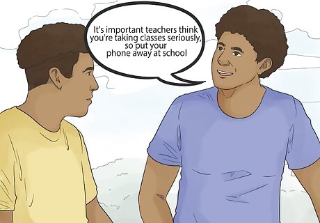 Talk about how texting in school can hinder their future. Most schools prohibit bringing cell phones into the classroom, but that doesn’t always stop teens from doing so. When your teen is texting instead of paying attention, their grades can fall. Additionally, they can get in trouble for texting, which can earn them marks on their permanent record. If your teen is focused on getting into a good college, explain how texting while in school can prevent that from happening. You might say, "I know your reputation with your teachers is crucial to your college applications. It's important teachers think you're taking classes seriously, so put your phone away at school."