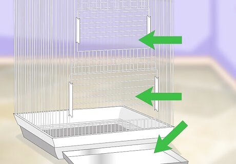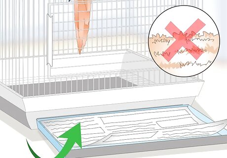 Cover the bottom of the cage with newspaper. The cage’s floor should always have a disposable cover to catch droppings. Newspaper is the best choice, since you can just grab the whole sheet, crumple it up, and toss it. Stay away from shredded paper or wood shavings, as these will fly around if your parrot flaps its wings.