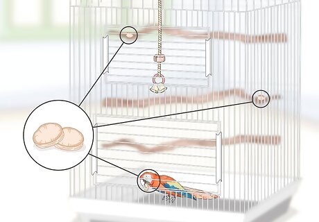 Get a cage with multiple doors and a removable litter tray. The cage should have an entry door large enough for your parrot to fit through and a smaller feeder door to make changing food and water easier. Both should securely lock. In addition, go for a cage with a bottom litter tray that slides out to make daily cleaning more convenient. Macaws are intelligent and can sometimes figure out cage locks. If you want to stay on the safe side, you can lock the cage doors with small padlocks.