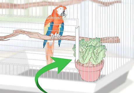 Keep bird-safe plants in the enclosure. In addition to enriching your macaw’s habitat, some plants, such as kale, can improve its diet. Before adding any plants to the enclosure, make sure they’re safe for birds and pesticide-free. If you’re not sure whether a plant is bird-safe, you can ask your avian vet, breeder, or plant nursery. You can also find exhaustive lists of safe and toxic plants online.