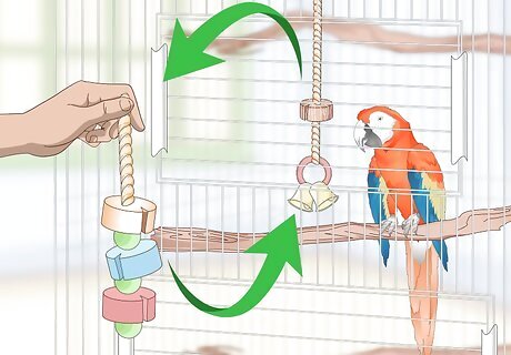 Keep a steady rotation of toys in the enclosure. Provide toys with different colors, textures, and moving parts to help keep your macaw entertained. Chew toys are particularly important, as macaws instinctively love to chew and destroy. Rotating the toys will help prevent boredom, so swap an old one out with a new one or another from its collection every one to two weeks. When you introduce a new toy, play with it to help your macaw get used to it.