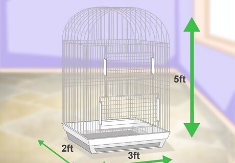 Provide the largest enclosure possible. While macaw species vary in size, most are large birds that require plenty of space. The minimum recommended size for large species is 3 feet (0.91 m) by 2 feet by 5 feet (about 1 m by 1.2 m by 1.5 m). Smaller species are still high energy and need lots of space. The minimum recommended size for mini-macaws is 2 feet (0.61 m) by 2 feet by 3 feet (60 cm by 60 cm by 90 cm). Bars should be spaced 1 to 1.5 inches apart.