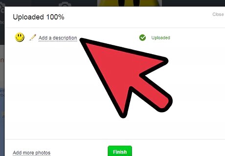 Include a photo description. Moreover, you can add a description to your uploaded photo so people can get a sense early on of what kind of person you are (serious, funny, casual, intellectual, and so on). Hit the “Finish” button at the bottom of the screen to continue with the process.