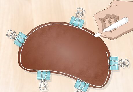 Place weights on top of the pattern pieces before you cut the fabric. If you are using a pattern to sew fake leather, you will need to use the pieces as your guides for cutting. To avoid damaging fake leather fabric, use paper weights to hold the pattern pieces in place on top of the fake leather fabric. You can use paper weights, clean rocks, or any other small, heavy item to hold the pattern pieces in place. Make sure that you use plenty of weights to hold down all of the edges of the pattern pieces. Place a weight every 3 to 4 inches (7.6 to 10.2 cm) along the edges of the pattern pieces.