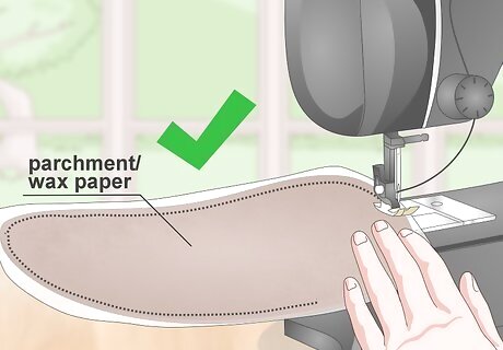 Use parchment or wax paper to help the presser foot glide. You can also use parchment or wax paper to help the metal presser foot glide over your fabric. Place a sheet of wax paper or parchment over the area of the fake leather fabric you are going to sew. Then, slide the fabric and the wax or parchment paper under your sewing machine’s presser foot and begin sewing. Sew through the paper and fabric at the same time. After you are done sewing, tear the paper away from the stitches. This is a good option if you do not have a special presser foot to help the fake leather fabric glide under the presser foot.