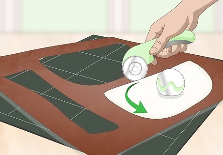 Cut fake leather with a rotary cutter and cutting mat. It is important to have a sharp tool to cut fake leather since it tends to be thick. Place the leather on a plastic cutting mat and use a rotary cutting tool to cut the fake leather along the edges of the pattern. You use a rotary cutting tool similar to how you would cut a pizza. Hold the rotary tool by the handle and roll the blade over the areas of the fake leather fabric you want to cut. If you do not have a rotary cutting tool, then you can use a pair of very sharp scissors. Just be careful not to move the weights when you cut the fabric. Hold the scissors close to the table or other surface that the fake leather is resting on.