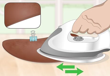 Iron the seams using the synthetic setting. Ironing down folded edges of the fake leather fabric before you sew them may help to make it easier to sew fake leather fabric. If your iron has a synthetic setting, set it to that. You should also place a t-shirt or thin towel over the fake leather fabric before you sew. If your iron does not have a synthetic setting, then use the lowest possible setting.