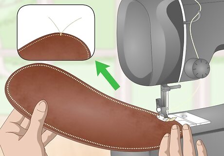 Sew to the end of the fabric and tie the thread in a knot. When you have reached the final edge of your leather fabric, sew all the way to the end of the fabric and off the edge. Then, cut the thread with several inches of excess thread remaining and tie the ends of the thread together twice to secure the last stitch.