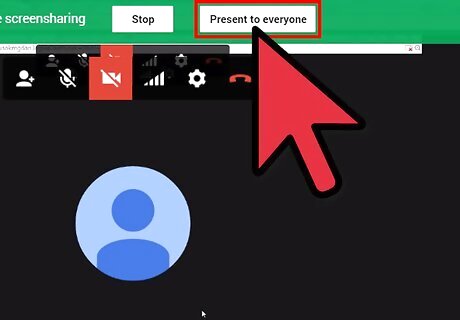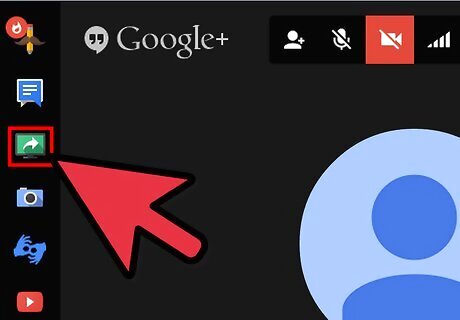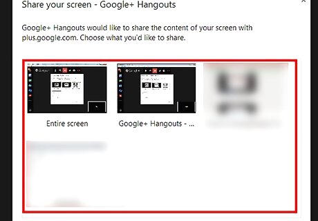 Find and click the screen you'd like to share with the group. Any actions you perform with your mouse and keyboard will be able to be viewed by the other members who have visited the Hangout. Any window that is open is able to be shared, including your computer's desktop, or the items that are being shown in Fullscreen mode.