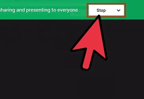 Go back to the Hangout window when you are done screensharing. Click the "Stop" button from the top bar from the green toolbar.