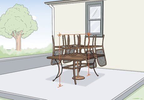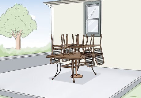 Stack your furniture together to wrap them in a single bundle. To shrink wrap furniture to protect it over the winter, stack your furniture together if possible. If you’re wrapping a table and chairs, put a blanket on top of the table and stack the chairs upside down on top of it. If you’re only wrapping chairs, stack them on top of one another. Feel free to bundle your furniture however you’d like to stack it or minimize the amount of space it’s taking up. If you have a patio umbrella, leave it in your table and lower the pole as far as it will go. Then, wrap a few bungee cords or rubber bands around the umbrella to keep it from opening while you work. If you have smaller items you want to protect over the course of the winter, leave them underneath the table or chairs that you’re stacking.