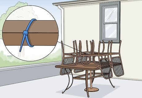 Tie your furniture together to secure it if you stacked it. If you have a bundle of furniture items that you’ve stacked together, use zip ties or bungee cords to tie your items together so they don’t tip over. Connect armchairs by tying the armrests of different seats together and tie furniture legs to other furniture legs. Tie your furniture together as needed to ensure that it doesn’t slide around while you’re wrapping it or fall over during turbulent weather.Tip: There’s no single correct way to secure your furniture items. So long as your individual pieces are tied to one another, you should be fine.