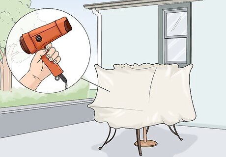 Install a vent to prevent condensation from building up if necessary. If there isn’t any air flow at the bottom of your furniture, install a vent. Buy a plastic vent cover from a shrink wrap company. Peel off the adhesive backing or follow the manufacturer’s instructions to stick it to the side of your shrink wrap. Then, cut a small 1–3 in (2.5–7.6 cm) hole in the shrink wrap inside the area covered by the vent to finish securing your outdoor furniture for the season. The vent will keep condensation from building up in your furniture over time. It is not necessary if there is plenty of air flow in the furniture, though.