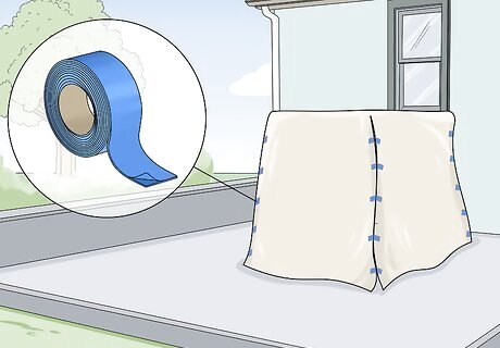 Pull and tape the areas that you cut to hold the wrap in place. To keep the shrink wrap still while you’re heating and securing it, use basic tape to secure any cut portions together to keep them from blowing around in the wind. For every location where you placed a relief cut, grab the shrink wrap and pull it taut. Then, place a small piece of tape over the tear to hold the fabric tight. You will remove these pieces of tape later, so don’t press them into the wrap so hard that you won’t be able to remove them. Feel free to use regular clear tape. You can also use painter’s tape, masking tape, or any other tape that won’t leave a residue. Duct tape won’t work for this, though.
