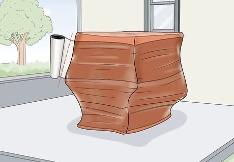 Peel off the film and press it against your furniture without cutting it. Peel the edge of the plastic moving film off of the roll and press it against the flattest surface of the furniture item. This may be a leg of a table, back of a chair, or platform for a cushion. Press the film against the furniture to adhere it to the surface.Tip: Start wrapping at either the top or bottom of the furniture. Avoid starting in the middle, or you'll waste some of the shrink wrap. Ideally, you’ll wrap every furniture item with a single, continuous length of plastic. Do not cut the film or use multiple sheets unless absolutely necessary.