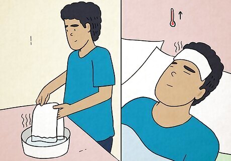 Fake a fever. Your parents will probably want to check if you have a fever or not, since a fever can be the sign of true illness. To convince them you’re really sick, you’ll need to make them believe you have a temperature. Soak a towel in hot water, wring it out, then place it against your forehead for 1 minute. This will heat up your head and body and make your fever more believable. Boil some water in a kettle, then pour it into a bowl. Lean over the bowl until your skin feels flushed, then step away. This will make you feel clammy. Rub a thermometer between your hands until it reaches 99–101 °F (37–38 °C). Don't go higher, however, or you might risk a trip to the hospital.