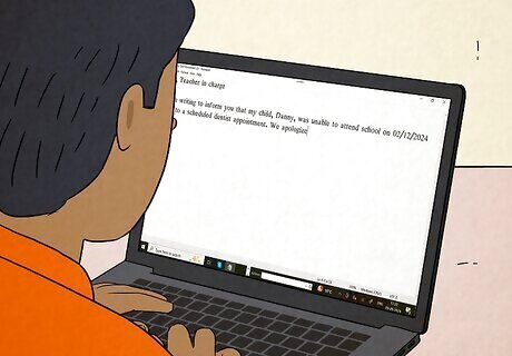 Fake a note from your parents. When you’ve skipped a day at school, your school will want to know where you’ve been. Write a pretend note from your parents to explain why you were absent. You can choose any excuse that sounds real, like you had to go to a funeral, had a dentist appointment, or that a pet died. Type the note instead of writing it by hand. Your handwriting probably doesn’t look like an adult’s handwriting to a teacher, so it won’t be convincing. Typing the note is safer, and it will also look more official.