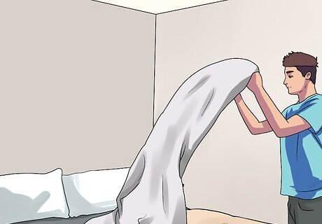Eliminate light sources. Darkness is the first natural signal to your body that it is time to go to sleep. Too much light will keep your body from being able to properly relax and become ready for sleep. Use curtains on windows or place a rolled towel beneath the door to block light and noise. Pack a couple of clothespins or metal binder clips to hold the curtains shut if necessary. Wear a sleeping mask to cut down on potential sleep disturbances from too much light. If you make the sleep mask a part of your everyday bed routine, putting the mask on also signals your body that it is time to relax. This includes artificial light, too. Things like nightlights and even digital clocks can interrupt the process of falling asleep. Eliminate as many forms of light as you are able to, either by shutting them off or wearing a sleep mask.