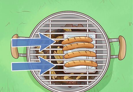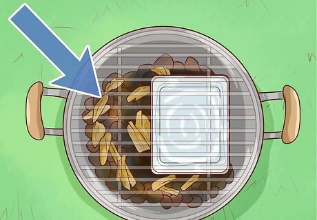 Place wet wood chips or pellets directly onto the coals. Use whatever hardwood you prefer to smoke your meats. Make sure the wood is soaked in water before adding it to the grill or else it will burn easily. Sprinkle a handful of wood chips over the charcoals and replace the grill grate. Use maple if you want to add some sweetness to your sausages. Apple and cherry wood add some subtle sweet and mild flavors. Try hickory or pecan wood for a strong, pungent flavor.