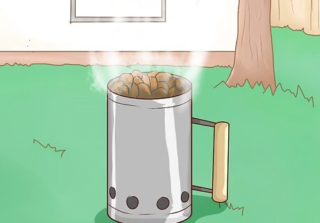 Start burning your charcoal in a chimney. Fill the metal charcoal chimney with the unlit coals. Use a utility lighter to light the coals on the bottom of the chimney and set it onto the grill grate. Let the charcoal heat up for about 15 minutes. Charcoal chimneys can be purchased wherever you can find barbecuing supplies.