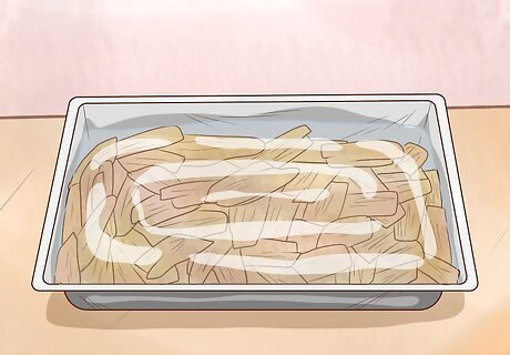 Fill a tray or aluminum foil with wet wood chips or pellets. Wet the wood chips so they don’t catch fire when they’re in the grill. Line a cooking tray with a handful of the chips and place them in your grill over the burner. Alternatively, wrap a handful of wood chips in aluminum foil and poke 5-6 holes in the top so smoke can escape. You can also buy a smoke tube for your grill. Fill the tube with wood chips or pellets and light the end on fire so it burns through so it produces smoke.