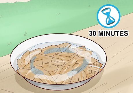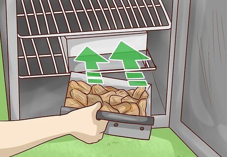 Soak wood chips in water for 30 minutes. Purchase whatever kind of wood chips you want to use for smoking your meat. Fill the chip tray in your smoker so it’s even with the top before pouring the wood chips into a container with water. Let the water absorb into the chips so they don’t burn as quickly in your smoker. Wood chips for smoking can be purchased at any store that sells barbecuing equipment. Experiment with different types of wood to try new smoked flavors on your sausage. Types of Wood to Use For mild-flavored sausages, try maple, apple, cherry, or oak pellets. If you want sausages with a prominent flavor, use hickory, pecan, walnut, or mesquite chips.