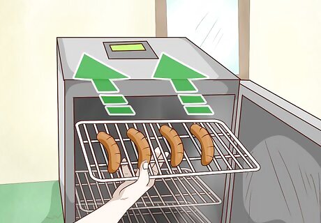 Place your sausages inside your smoker. Set the sausages on a rack 1 inch (2.5 cm) apart from one another so the smoky flavor distributes evenly. Slide the rack into the smoker and quickly close the door. Don’t open the door again until the sausages are finished or else heat will escape your smoker and prolong your cook time. You can smoke store-bought or homemade sausages. Try smoking precooked sausages to add even more of a smoky flavor.