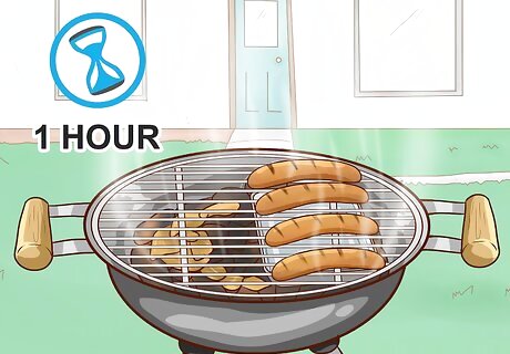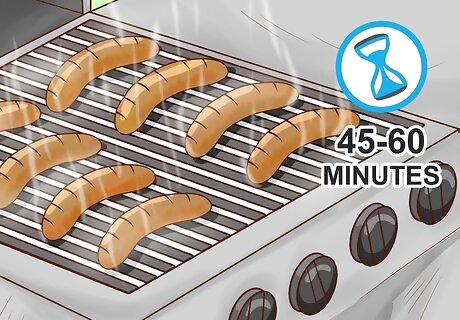 Cook the sausages for 45-60 minutes. Keep the lid closed on your grill until you check on your sausages. Use a meat thermometer to check if they are 165 °F (74 °C) on the inside. When your sausages are fully cooked, take them off of the grill and serve them hot. Store any leftover sausages in the fridge for 4 days or in your freezer for up to 3 months.