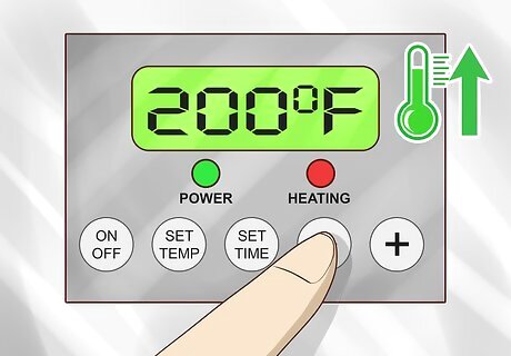 Heat your smoker to 200 °F (93 °C). If you have an electric smoker, set the temperature using the controls on the machine. For a charcoal smoker, start your coals in a chimney and let them heat for 15 minutes before you pour the charcoal into the bottom of your smoker. Use the built-in thermometer or a laser thermometer to check the temperature. Keep your smoker closed while it’s warming up so the heat doesn’t escape.