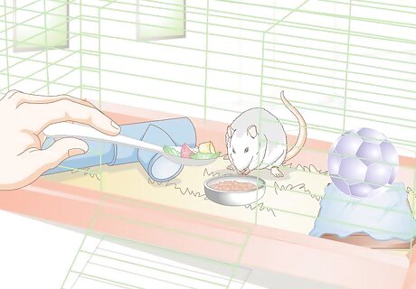 Feed your rat. Rats have a lot of energy and a high metabolism, so feeding them properly is important to their health. However, rats are also prone to obesity, so it’s equally important to make sure you’re giving them the right amount and types of food. Give your rat a small bowl of lab blocks every day. Give her about one tablespoon of fruit and vegetable treats every day. For example, you can give her some greens and a broccoli floret, or a slice of apple or whole strawberry. Give her a hard treat like a dog biscuit or branch from a fruit tree once a week to keep her teeth healthy. Feed your rat at night because rats are nocturnal. Place an attachable water bottle in the cage so she can drink continuously.