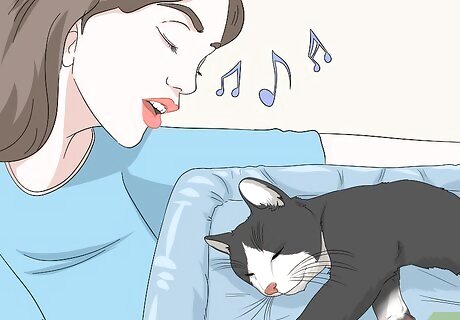 Speak or sing soothingly to the cat. One great way to relax your cat for massage is to use voice massage. Voice massage is essentially repeating a phrase or song in a soothing voice to prepare your cat for contact. What you actually say or sing is not as important as the tone of your voice, which should be as calm and soothing as possible.