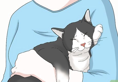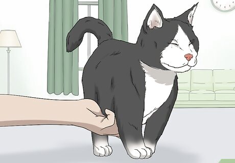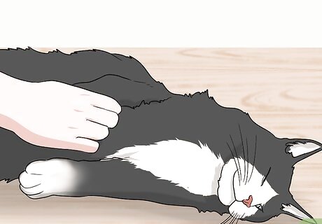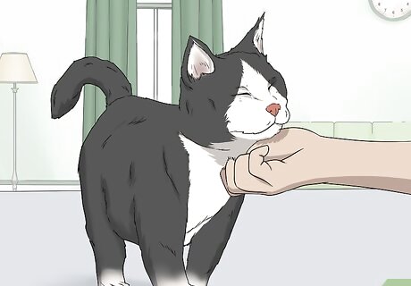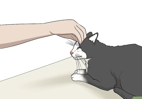 Massage under the cat's chin. Gently lift up on the cat's chin with your fingertips, and, as the cat lifts its head, begin stroking the chin and neck with your fingers. Move from the throat to the tip of the chin. If the cat looks up, they like this motion. You can also move your fingers in a circular motion underneath the chin for a different sensation.
