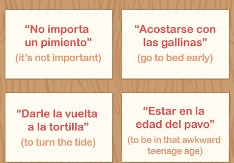 Study up on Spanish idioms. You're probably so used to common English idioms like "it's raining cats and dogs," that you don't even pause to consider how strange they are. Spanish has tons of idioms too, and it's best to study up on them so that you don't get totally confused when you're speaking with native speakers. If someone says “del año de la pera,” you might translate that literally to mean "from the year of the pear," but it just means "very old." Once you’ve gotten the hang of a few idioms, you can sprinkle them into your own conversation, and sound much more fluent. Other fun idioms include: No importa un pimiento: it’s not important. (Literally: it’s not worth a cucumber.) Acostarse con las gallinas: go to bed early. (Literally: go to sleep with the hens.) Darle la vuelta a la tortilla: to turn the tide. (Literally: to flip the tortilla.) Estar en la edad del pavo: to be in that awkward teenage age. (Literally: to be the age of the turkey.)