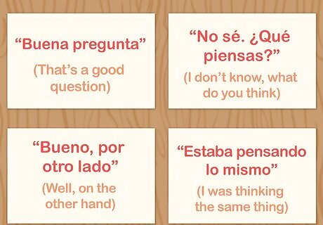 Learn filler phrases. Spanish class may have given you a big vocabulary and a lot of verb conjugations, but chances are you don’t know how to say a lot of the filler words that go into fluffing up normal conversation. Learn phrases that you can sprinkle in when you need to stall for time, or avoid an awkward pause. Some examples: That’s a good question: Buena pregunta. I don’t know, what do you think: No sé. ¿Qué piensas? Well, on the other hand: Bueno, por otro lado. I was thinking the same thing: Estaba pensando lo mismo. These phrases don’t add much substance to the conversation, but they let you speak more rapidly and convincingly.