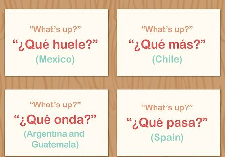 Study up on Spanish slang in your area. One of the best ways to speak like a native-speaker is to learn some of the contractions and slang words common in your area. If people don’t speak Spanish where you live, then learn the slang for a Spanish-speaking place that you intend to visit. Different countries and regions have different local slang, and you can find lists online. For example, the simple expression “What’s up?” is very different in different countries: ¿Qué huele? (Mexico) ¿Qué más? (Chile) ¿Qué hubo? / ¿Quiuvo? (Chile) ¿Qué onda? (Argentina and Guatemala) ¿Qué pasa? (Spain)