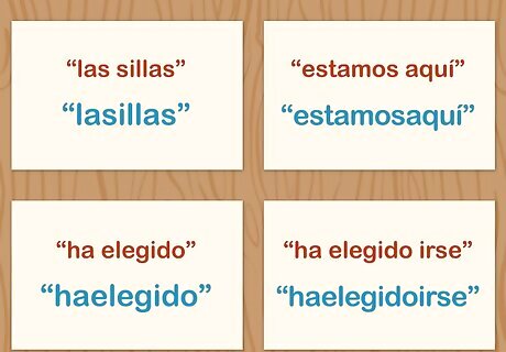 Blend the end of one word with the beginning of the next. In conversational Spanish, native-speakers often blend the last syllable of one word with the first syllable of the following word. This makes speaking much quicker. You can do this when the word ends with the same consonant as the next one starts, like if you’re saying “las sillas,” pronounce it “lasillas.” You can also do this when the first word ends in a consonant, and the next word starts with a vowel. For example, pronounce “estamos aquí,” as “estamosaquí.” Blend the words together if one ends in a vowel and the next starts with a vowel. For example, “ha elegido,” would be “haelegido.” You can do this for a whole string of words! For example, "ha elegido irse" would be "haelegidoirse."