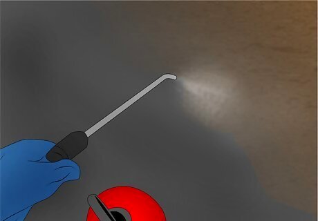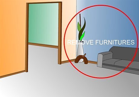 Clear the area where the concrete staining will occur. If the project involves staining a concrete floor, that means all furniture and area rugs are removed from the space. For concrete counter tops, remove all items from the counter top, and place them in another room or at least in a distant area of the same room, covering them with a drop cloth.