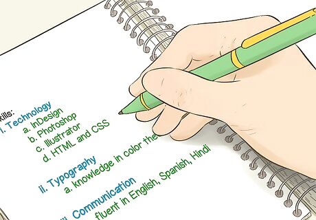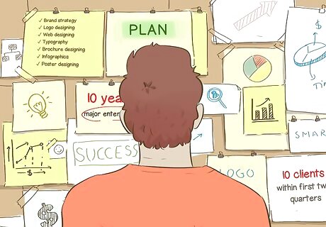 Assess your skills and goals. Before you start down the road to setting up your own business, take time for some thorough and honest self-evaluation. Take stock of your strongest and weakest attributes as a graphic designer, and ask yourself what you hope to achieve in the field and in your life. If you're great at coming up with fresh ideas for existing clients, you might set a goal of establishing long-term business relationships with a smaller number of key clients. In addition to self-assessment, ask trusted colleagues, supervisors, and mentors to evaluate you and offer guidance. Ask for honesty and take their opinions seriously. Not everyone is cut out to start their own business. If you excel creatively but aren’t the best at managing all the small details, for example, running your own business may be more of a challenge than it’s worth.