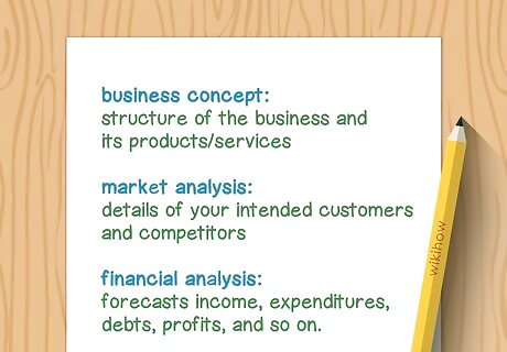 Create a business plan. You’ll definitely need a good business plan in order to secure investors or financing, and it’s a great resource to have in any case. Properly done, a business plan aligns your vision for the business with the realities of the market and customer base. While business plan formats vary, they generally have 3 essential components: the business concept, which describes the structure of the business and its products/services; the market analysis, which details both your intended customers and competitors; and the financial analysis, which forecasts income, expenditures, debts, profits, and so on. Business plans usually start with an executive summary, which essentially boils down the entire business plan. Though it goes first, write it last, and make it no more than about 10% of the length of the entire business plan.