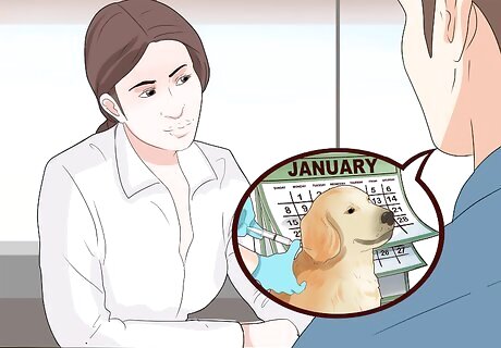 Discuss your dog's vaccination schedule with your veterinarian. Your veterinarian will tell you when your dog needs its vaccinations and when it should get boosters, which are infections that revive your dog's vaccination immunities. In most cases, vaccination boosters are done at annual checkups. However, not all vaccinations are done annually. This means that you will need to set a schedule that takes into account when a variety of vaccinations need to be administered. Your veterinarian will be able to keep track of when vaccinations should be done in their computer system. However, in order to stay updated on when dog vaccinations should occur, you should keep track of these dates as well.