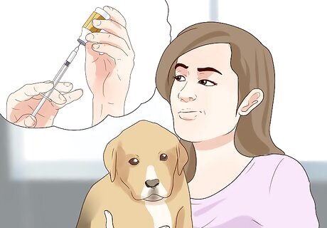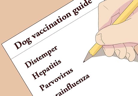 Identify essential vaccinations. There are some vaccinations that all dogs need to receive. These vaccinations prevent highly contagious diseases that are a health risk to all dogs. For example, all dogs must get both a distemper and rabies vaccination. The distemper vaccination is called DHPP because it is a combination shot that protects your dog from distemper, hepatitis, parainfluenza, and parvovirus. Distemper is a serious viral disease that attacks the respiratory, gastrointestinal and nervous systems. It is often fatal. Infectious canine hepatitis (ICH) can lead to illness or death, especially in puppies. It can cause fever, congestion, depression, organ damage, and blood coagulation disorders. Parainfluenza is one of the causes of kennel cough. It can cause flu-like symptoms in your dog for days or weeks and may develop into pneumonia. It is highly contagious. Parvovirus is a serious, highly contagious viral disease that can be fatal, especially to puppies. Symptoms may include lethargy; loss of appetite; abdominal pain and bloating; fever or low body temperature (hypothermia); vomiting; and severe, bloody, diarrhea. Most deaths occur within 48 to 72 hours following the onset of symptoms. There is no cure and treatment is only to support the dog's system while it fights the virus. Rabies is a dangerous and deadly disease for humans and animals, and it is essential that you protect your dog and everyone who might come into contact with your dog. Rabies is usually spread through the saliva of an infected animal, and attacks the central nervous system. There is no cure or treatment for rabies. If your dog contracts rabies, they must be euthanized. The rabies vaccination is mandatory in a lot of areas. It may be required every year or every three years. If your dog gets out of date with that vaccination your veterinarian may be required to report the lapse in vaccination to local authorities.