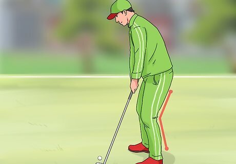 Maintain a shallow bend in your knees throughout your swing. Sink your weight into your legs until the head of your club is lined up with the midpoint of the ball. Then, lock yourself into your stance as you initiate your windup. Bending your knees brings you closer to the ball, which decreases the chances that your club will strike too high and deflect off of the top. Make sure your knees stay behind your toes at all times. This position should come naturally once you’ve got your torso at the right angle. It’s even more crucial to stay at the correct height when hitting the ball off of the ground, as opposed to a tee, which adds a little extra height.