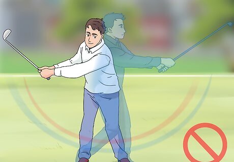 Avoid swaying side-to-side during your windup. A textbook windup calls for you to load up most of your weight on your back foot before transferring it to your front leg as you lean into your swing. Try not to let the rotation of your shoulders pull you too far off to the side, though. This shifts the bottom arc of your swing from the center of the ball to a point just in front of it. As the head of your club drops into the impact zone, you’ll only manage to clip the ball on the upswing. Look down at the ball as you reach the peak of your windup. If it isn’t in the same position in relation to your head, it means there’s too much lateral movement in your swing. Even if you manage to correct your body position during your swing, you’ll still have taken your club out of alignment with the ball.Tip: Not being able to pick up either of your feet without losing your balance is another sign that you’re not transferring your weight correctly.