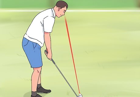 Keep your eyes on the ball. Watch the ball intently from the time you assume your stance to the time the ball leaves your club. Doing so can improve your overall focus and accuracy by giving you the ability to better gauge the distance between your club and the ball. On the flipside, looking away for even an instant can leave you uncertain of where the ball is and cause other parts of your form to loosen up. Practice going through the motions of your windup slowly, aiming to spot the point on the ball where the head of your club will make contact each time. Another benefit of a fixed gaze is that it’s a good way to overcome the tendency to raise your head and shoulders during your swing.