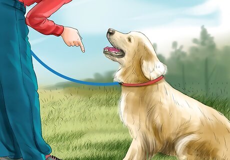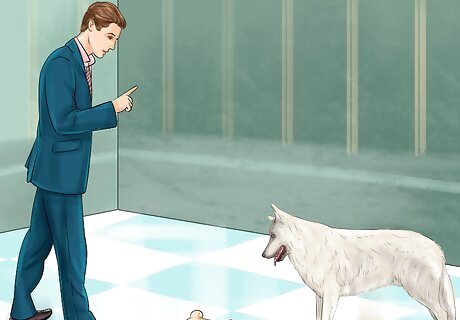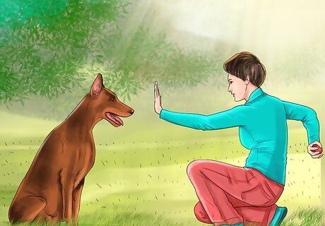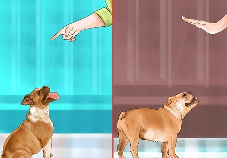 Teach "sit" and "stay" commands. Two of the most useful commands for a dog to learn are "sit" and "stay." These commands, when used properly, can prevent displays of aggression and stop bad behavior in its tracks. Have your dog sit. If your dog hasn't learned the sit command yet, you can help teach it by gently pushing your dog's rear end to the floor while calmly but firmly saying "sit." Once your dog sits on command, give it treats and verbal praise. Give the command "stay" while slowly taking a few steps back from your dog. You may have to repeat the command with each step, or once may be enough, depending on your dog. If your dog moves before you release it, go back to where you were and start over. If your dog obeys, break the hold by saying "good dog" or "okay, come" and offer treats and verbal praise.