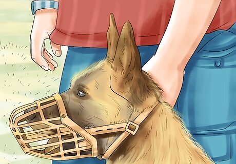 Try using a restrictive harness. If your dog is behaving dangerously, you'll need to use proper restraining equipment. These devices can be used on walks as well as around the house - just don't leave your dog unsupervised while wearing a leash, harness, or muzzle, as this may lead to injury. Using a head halter may be more effective than a regular collar. The head halter restricts your dog's ability to move and lunge while on the leash. If your dog has ever bitten someone, you should have your dog wear a basket muzzle when it's around other people or animals. Whether you use a muzzle or a head halter, make sure it is properly fitted to your dog's face. This will help prevent injuries to your dog and reduce the chances of your dog slipping free.